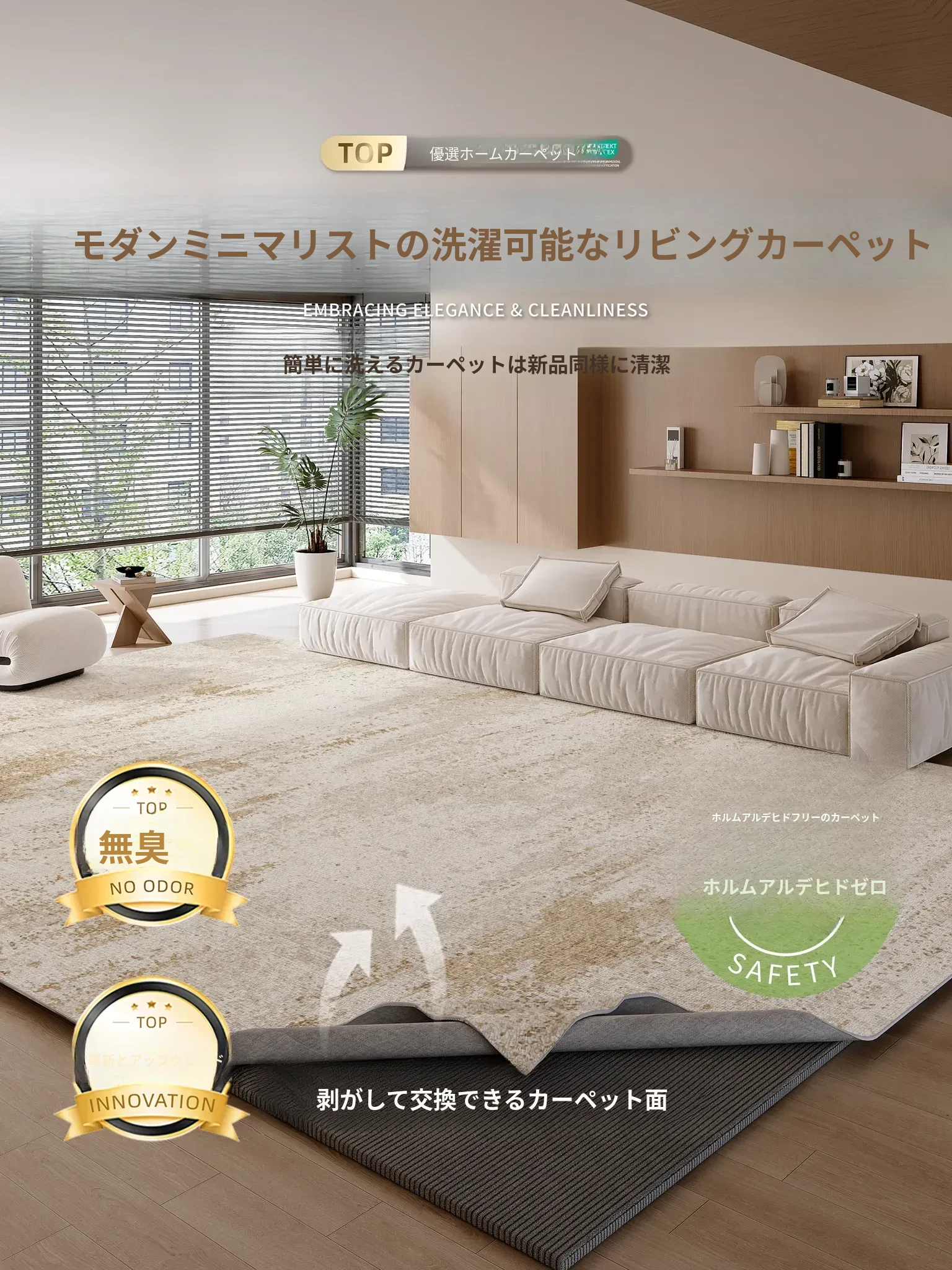 モダンでシンプルなデザインの洗えるカーペット - 高級感あふれる二重構造、取り外し可能なソファ用厚手防音マット。リビングルームに最適!清潔でお手入れも簡単、快適な空間を演出します。
